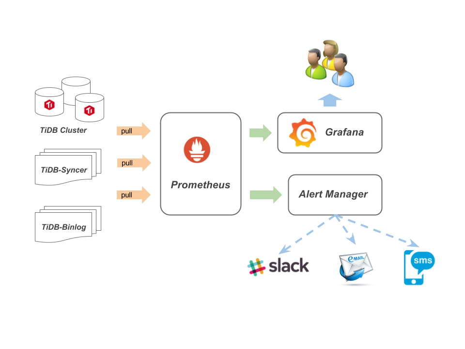 Syncer 使用开源时序数据库 Prometheus 作为监控和性能指标信息存储方案,使用 Grafana 作为可视化组件进行展示,配合 AlertManager 来实现报警。其方案如下图所示:
